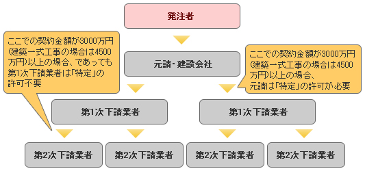 「特定」とは建設工事の発注者から直接請け負った建設工事について1件あたりの合計額が、3,000万円以上(ただし建設工事業に関しては4,500万円以上)となる下請契約を下請人と締結して施工させる場合に必要となる許可です。 一方、「一般」とは工事を下請に出さないで自ら行うとか、たとえ下請に出しても1件について3,000万円未満に限るというような場合の許可です。 なお、「特定」と「一般」は1業種について両方とることはできません。