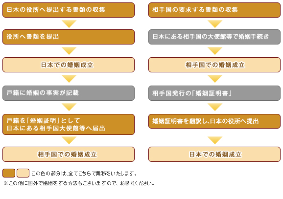日本に来る外国人の方の増加に伴い、国際結婚をされる方も増えてきました。 国際結婚といってもその形態は実に様々です。日本は結婚、離婚が簡単で、日本人同士のであれば、市役所、区役所に紙一枚を提出すれば終わりです。(※離婚に関してもお互いが同意してれば、紙一枚で済みます) ところが国際結婚では単純ではなく、国籍の数だけ法律があり、結婚する時期、場所、法律で定められた要件などをクリアしてはじめて結婚ができます。中には相手の外国人の方が再婚というケースもあるでしょう。国によっては離婚制度がないところもあります。国際結婚はケースによってその手続きが全て異なると言っても決して過言ではありません。